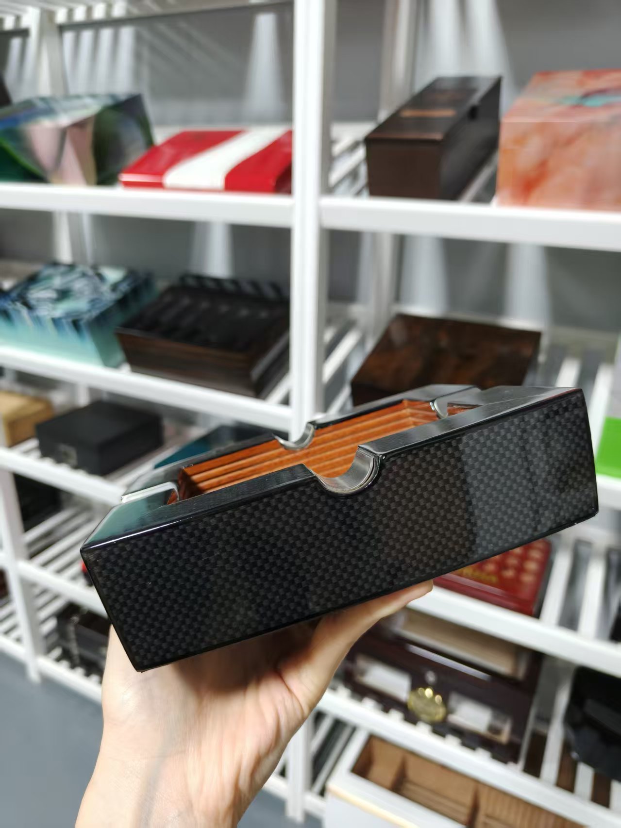 • Stable & Stylish Design: The weighted square base prevents tipping, while the carbon fiber-wood-metal contrast makes it a versatile decor piece for upscale living rooms, home bars, offices, or commercial cigar lounges.